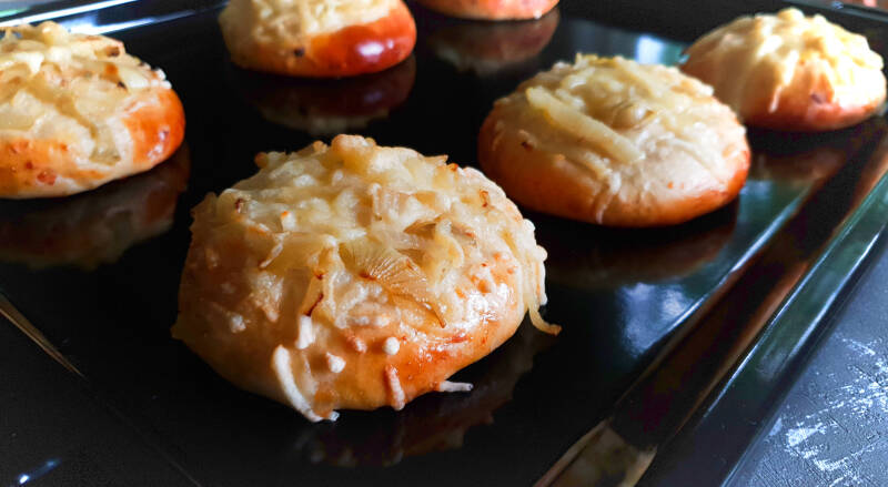 - Verdeel de uien en de overgebleven kaas over de bolletjes.