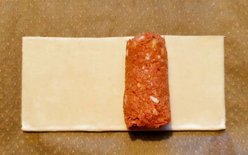 - Bestrijk het bladerdeeg rond het gehakt met een dun laagje ei.