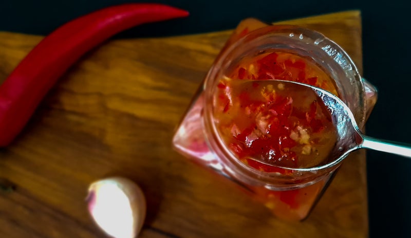 Sweet chilisaus kan je zowel als saus gebruiken, bijvoorbeeld voor door de noedels, of als dip, bijvoorbeeld voor ...