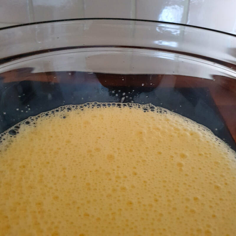- Klop de eieren zo luchtig mogelijk. Je zult zien dat het mengsel van eieren met de suiker eerst geel gekleurd is. Je ziet dan grote luchtbellen zitten. Naar mate het luchtiger wordt zal het mengsel steeds lichter kleuren. De luchtbellen worden steeds kleiner.