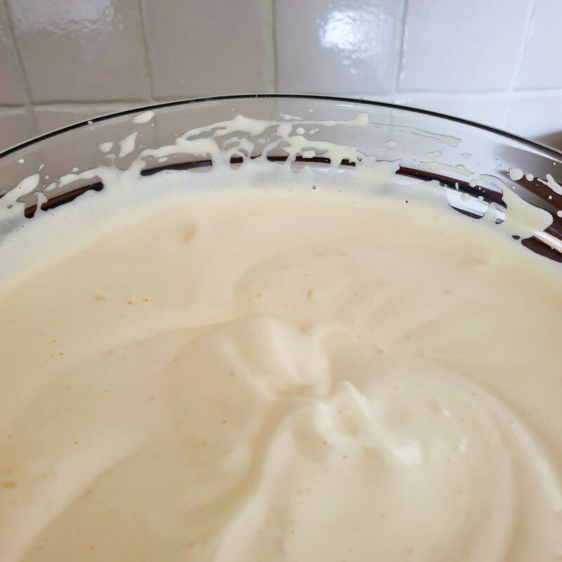 - Na ongeveer 10 minuten is het mengsel crèmekleurig, en is het toegenomen in volume. Het eiermengsel wordt steviger waardoor de golven van het mixen in het beslag blijven staan.