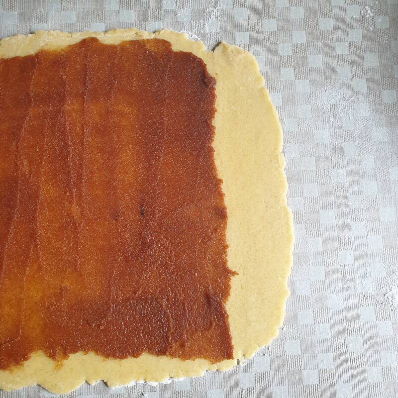 - Verdeel de kaneelvulling over de lap en laat aan één van de kort zeiden ongeveer 5 cm vrij.
