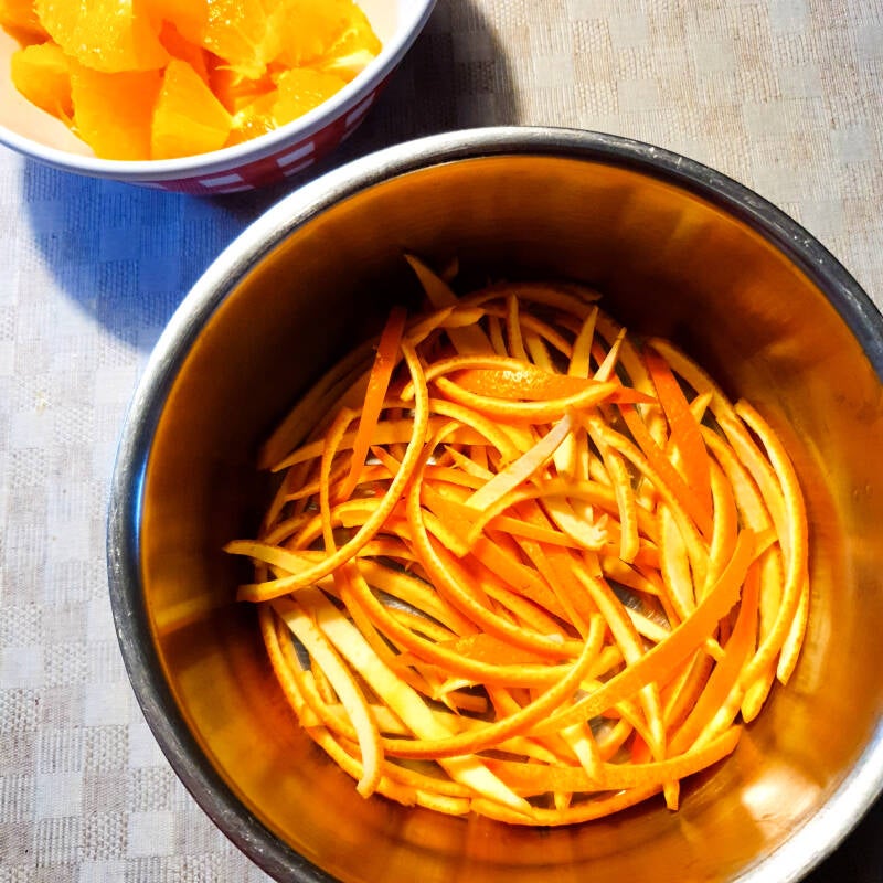 - Snijd restjes vruchtvlees van de schil af en verwijder ook het meeste wit van de schil zodat het oranje deel met een dun laagje wit overblijft.