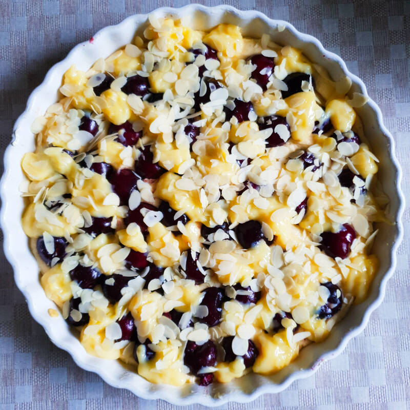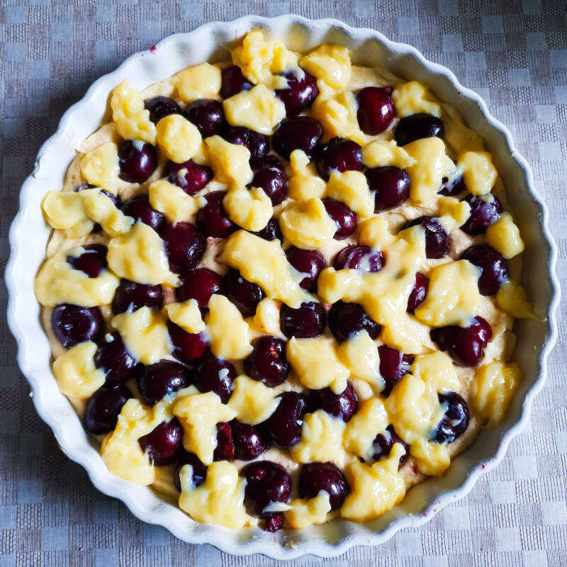 - Verdeel met een lepel de banketbakkersroom over het beslag.