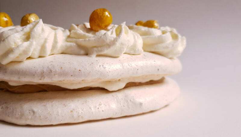 - Leg de schuimlagen op elkaar zodat de mokkacrème en de slagroom tegen elkaar aan liggen.