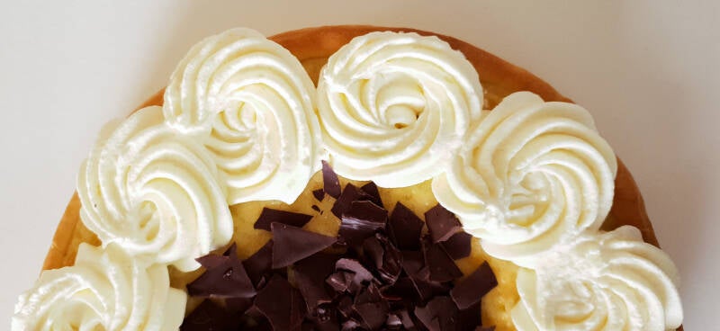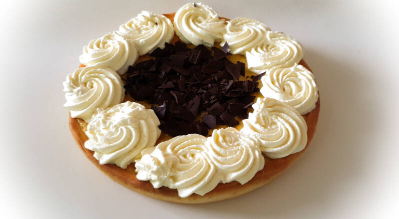 - Verdeel de slagroom naar eigen inzicht over de vlaai. Ik spoot grote rozetten op de rand van de vlaai.