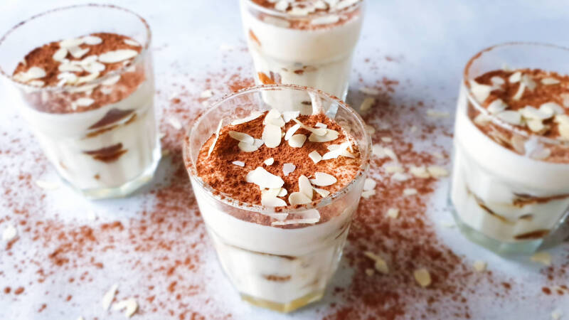 - Verdeel met behulp van een theezeefje een dun laagje cacao over de tiramisu. Strooi daarna nog een beetje amandelschaafsel over de tiramisu.